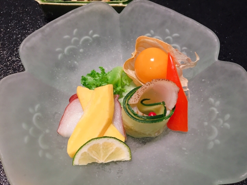この日の前菜は、「旬菜五種盛り(烏賊とんびとくらげ和え・鱚黄味焼・慈姑おこわ・牛肉八幡巻・夏野菜のアスピックゼリー)」でした。
