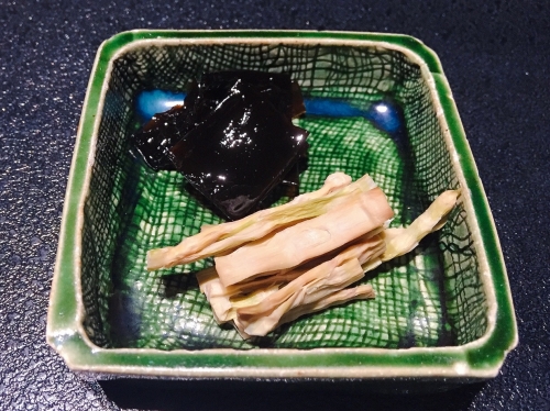 この日の小鉢は、本来は「料理長特製鱒寿司」でしたが、筆者のものは、アワビの煮たものに変更されています。
