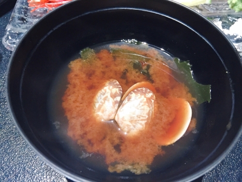 味噌汁はアサリの赤出汁。味噌汁もセルフサービスで、好きなタイミングでよそえます。香の物は「二種盛」でした。