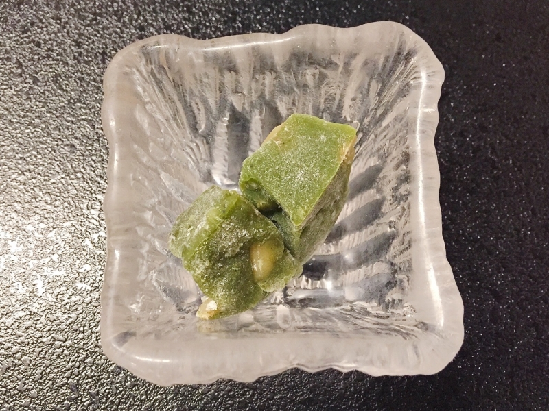 この日の水菓子は「抹茶羽二重餅」でした。抹茶味のお餅にクルミが練り込まれており、クルミの風味や食感を楽しめます。