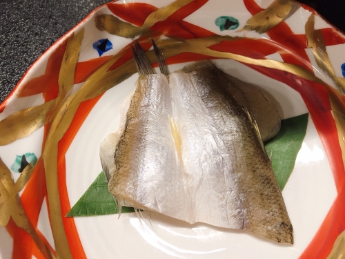 この日の焼物は、「生粋(きっすい)の庄川鮎 塩焼」でした。「生粋の庄川鮎」は小ぶりで、川魚臭さがありません。頭から尻尾まで食べられます。