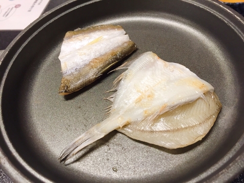 この日の焼物は、「焼物二種(県内産梭子魚、鰈)」でした。自分で鉄板で焼いて、いただきます。