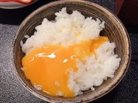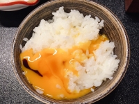 写真:トラベルライター 白身をご飯にかけ、混ぜた状態 |  写真:トラベルライター 黄身をご飯に乗せ、箸で黄身を少しだけ裂いた状態 |  写真:トラベルライター トナミ醤油をかけた状態 |