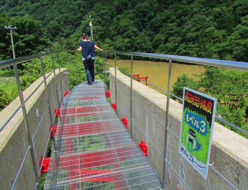 「多分日本一と思われる」箸の橋。自己責任で自由に渡ることができます。割り箸でできていると思うと心なしかグラつくような気分になりますが、乗ってみるとしっかりした石のような感触でした。