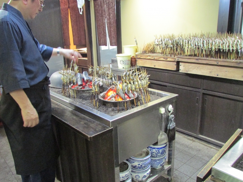 テーブル席には炭火が用意されていて、あゆの塩焼きを注文すると串をそこへ刺してくれます。