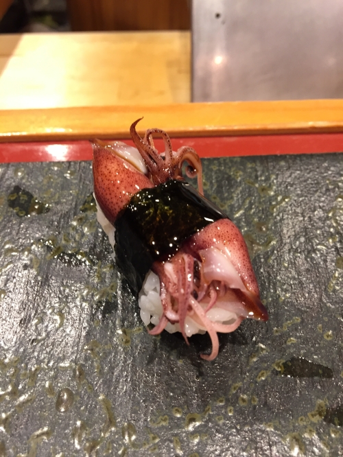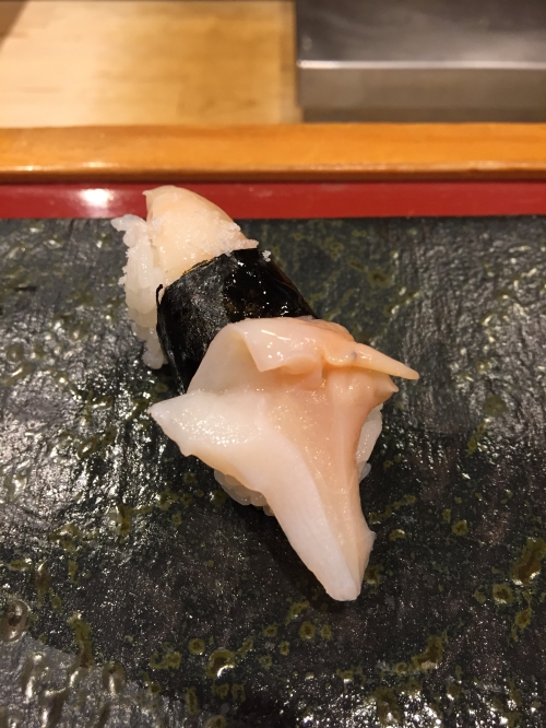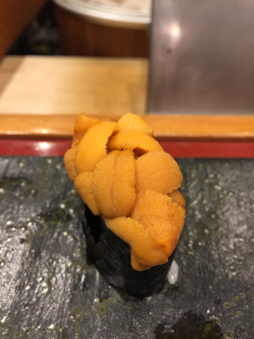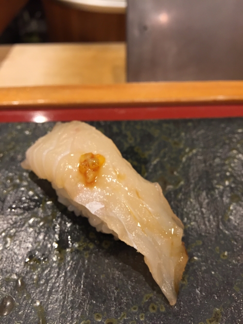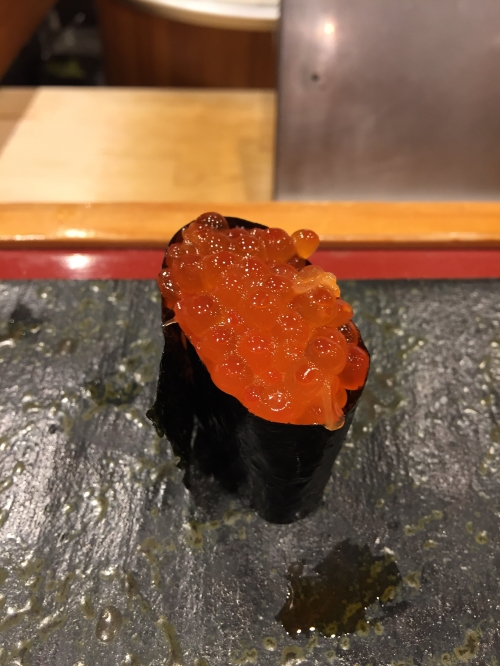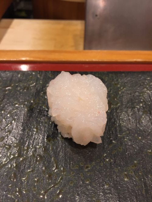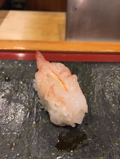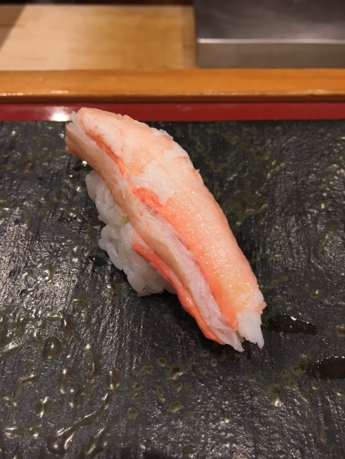 この日は、白エビ、ヒラメの昆布〆、ヤリイカ、ガンドウブリ、漬けマグロ、トロ、ウニ、いくら(醤油)、甘エビ、バイ貝、アジ、紅ズワイガニ、ホタルイカ、穴子、巻物2種(カッパ巻きとマグロのたたき)の計16貫。