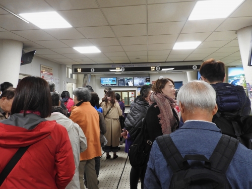 ご覧のように駐車場はまだガラガラ状態ですが、ツアーバスなどで来た観光客がかなりいて、改札口はこのぐらいの混雑具合でした。扇沢から黒部ダムまでの所要時間は16分です。