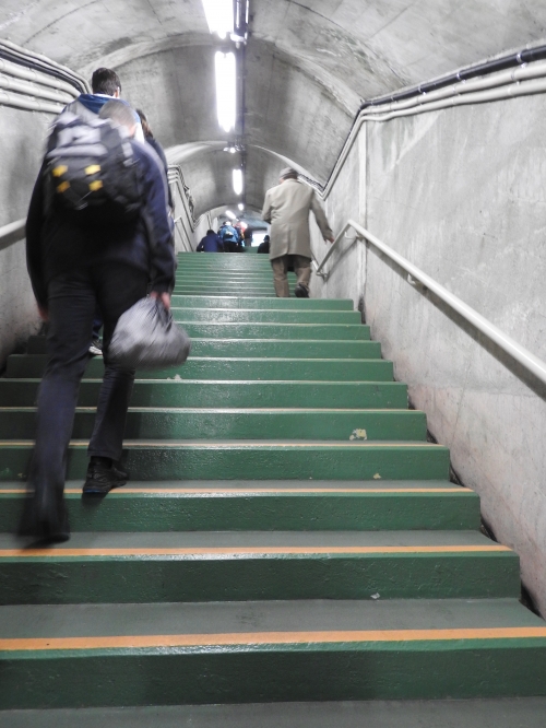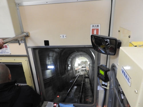 次の乗り物はケーブルカー。全長0.8Km、標高差400mの斜面(最高勾配31度)の斜面をケーブルに引き揚げられて5分ほどで登ります。山の中に掘られたトンネルを登って行きますので、景色はありませんが、走るのではなく、斜めのままグイーンと引き揚げられる感覚が面白いです。