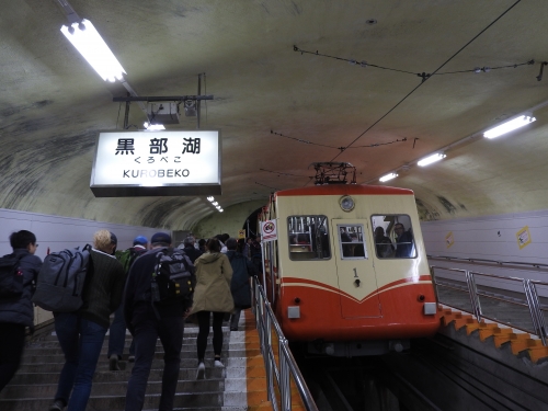 写真を撮ったり、お土産屋さんを覗いたりしながら、ダムのえん堤を歩いて、対岸の黒部湖側の向かうと、1時間かからずに、次の乗り物であるケーブルカーの黒部湖駅に到着します。
