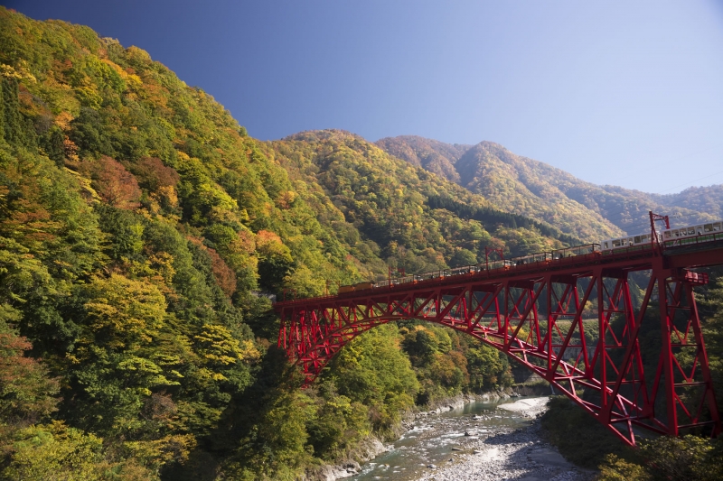 富山随一の紅葉の名所「黒部峡谷」。黒部と言えば「トロッコ!」というぐらいに有名な電車に乗れば、深い峡谷の大自然を堪能できます。谷の奥へ行くほど紅葉は色濃くなり、針葉樹林の緑とのコントラストは息を呑むほどの美しさです。