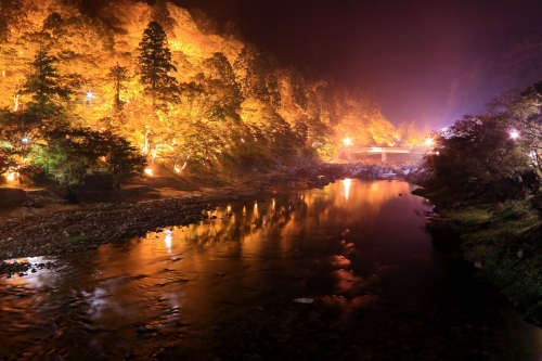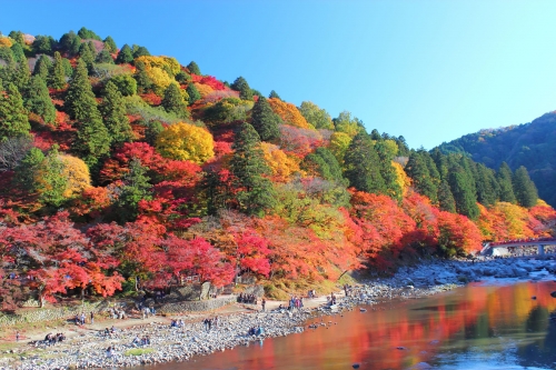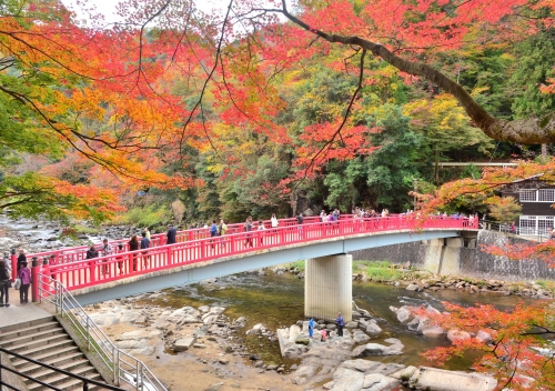 紅葉の名所として知られ、見頃を迎える11月中旬〜下旬ごろは特に多くの観光客が訪れる香嵐渓。赤、オレンジ、黄と、約4,000本の色づいたもみじが巴川がつくる渓谷を彩ります。特に香嵐渓のシンボルである真っ赤な「待月橋」ともみじのコラボレーションは圧巻!夜間にはライトアップも行われ、幻想的な空間をつくりあげます。