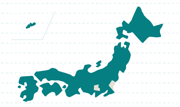 北海道、青森、岩手、宮城、秋田、山形、福島、栃木、群馬、埼玉、千葉、東京、神奈川、新潟、富山、石川、福井、長野、岐阜、静岡、愛知、三重、滋賀、京都、大阪、兵庫、奈良、和歌山、鳥取、島根、岡山、広島、山口、徳島、香川、愛媛、高知、福岡、佐賀、長崎、熊本、大分、宮崎、鹿児島、沖縄