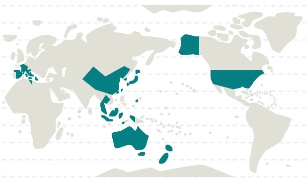 インドネシア、シンガポール、タイ、台湾、香港、マレーシア、日本、韓国、中国