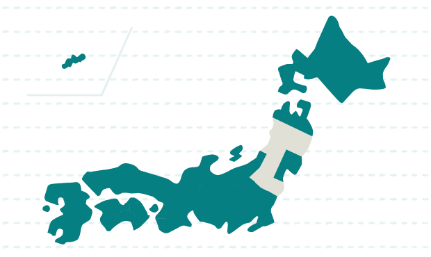 北海道、青森、宮城、茨城、栃木、群馬、埼玉、千葉、東京、神奈川、新潟、富山、石川、福井、山梨、長野、岐阜、静岡、愛知、三重、滋賀、京都、大阪、兵庫、奈良、和歌山、鳥取、島根、岡山、広島、山口、徳島、香川、愛媛、高知、福岡、佐賀、長崎、熊本、大分、宮崎、鹿児島、沖縄