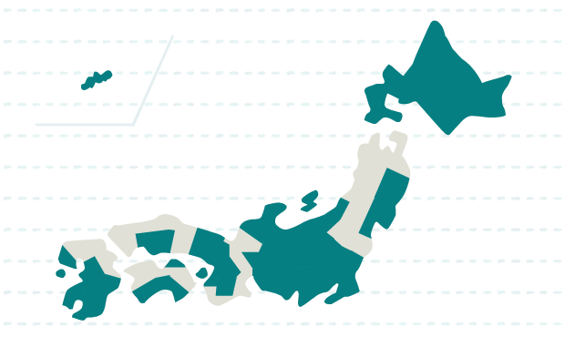 北海道、岩手、宮城、茨城、栃木、群馬、埼玉、千葉、東京、神奈川、新潟、富山、石川、山梨、長野、岐阜、静岡、愛知、京都、大阪、兵庫、奈良、広島、香川、高知、長崎、熊本、宮崎、鹿児島、沖縄