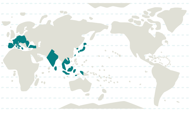 日本、韓国、カンボジア、タイ、マレーシア、インドネシア、ベトナム、インド、シンガポール、スリランカ、台湾
