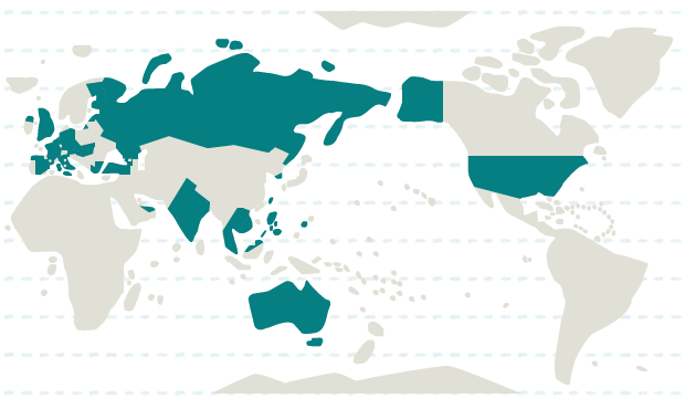 イギリス、イタリア、エストニア、オーストリア、オランダ、ギリシャ、ジョージア、スペイン、スロバキア、チェコ、ドイツ、トルコ、ハンガリー、フィンランド、フランス、ブルガリア、ベルギー、ラトビア、ロシア