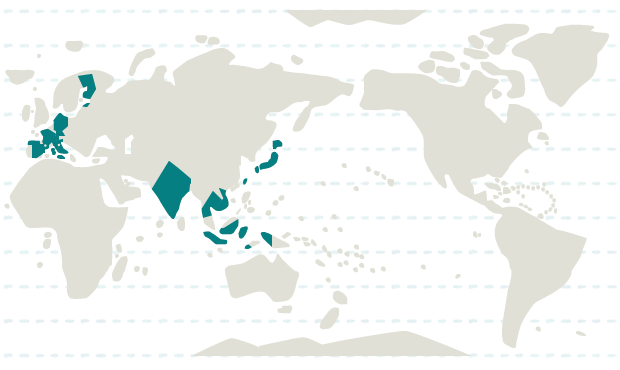 インド、インドネシア、カンボジア、タイ、台湾、ネパール、ベトナム、日本