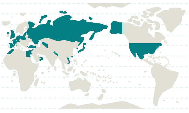 イギリス、ウズベキスタン、エストニア、スペイン、トルコ、ポーランド、ラトビア、リトアニア、ロシア、ドイツ、フランス、ベルギー