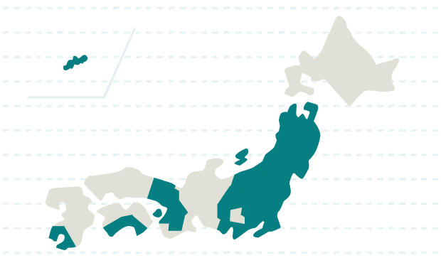 青森、岩手、宮城、秋田、山形、福島、茨城、栃木、群馬、埼玉、千葉、東京、神奈川、新潟、長野、静岡、京都、大阪、兵庫、奈良、高知、鹿児島、沖縄