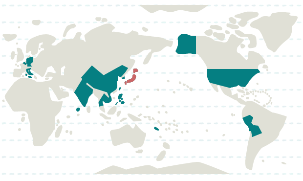 韓国、カンボジア、タイ、台湾、中国、フィリピン、ベトナム、日本、インド、モルディブ