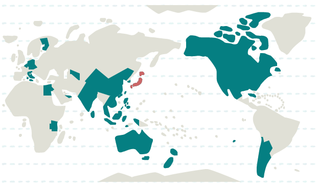 インドネシア、韓国、台湾、フィリピン、日本、タイ、ラオス、香港、マカオ、シンガポール、マレーシア、カンボジア、インド、中国、ベトナム、スリランカ、ネパール