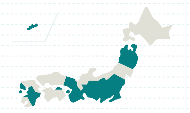 青森、岩手、秋田、福島、茨城、栃木、群馬、埼玉、千葉、東京、神奈川、山梨、長野、岐阜、静岡、愛知、三重、京都、大阪、兵庫、奈良、和歌山、香川、長崎、熊本、宮崎、沖縄
