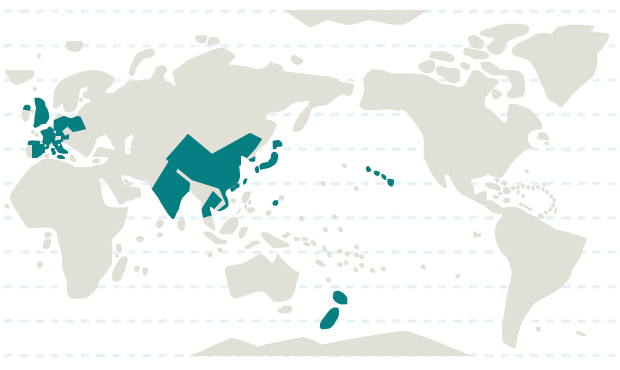 インド、韓国、タイ、台湾、中国、ベトナム、香港、マカオ、日本
