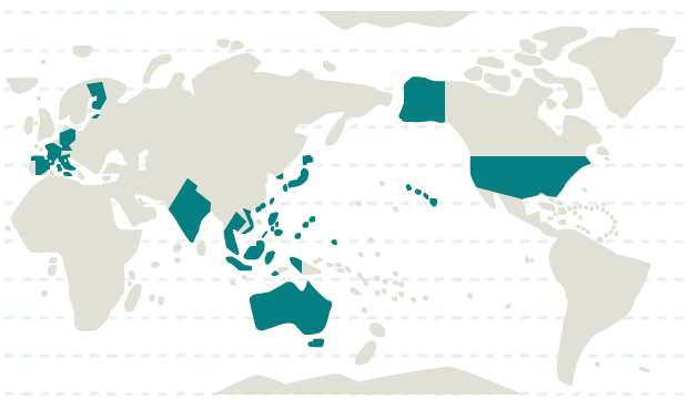 オーストラリア、北マリアナ諸島(サイパン)、グアム、パラオ、ミクロネシア連邦