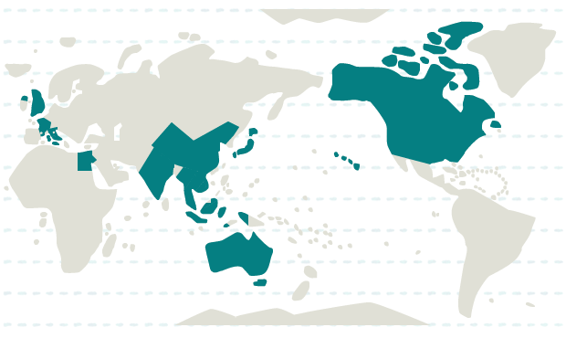 インド、インドネシア、カンボジア、シンガポール、タイ、中国、ネパール、ベトナム、マレーシア、ミャンマー、ラオス、日本
