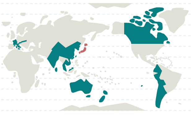 インド、韓国、カンボジア、シンガポール、スリランカ、タイ、台湾、中国、ネパール、香港、マカオ、マレーシア、日本、ベトナム、北朝鮮