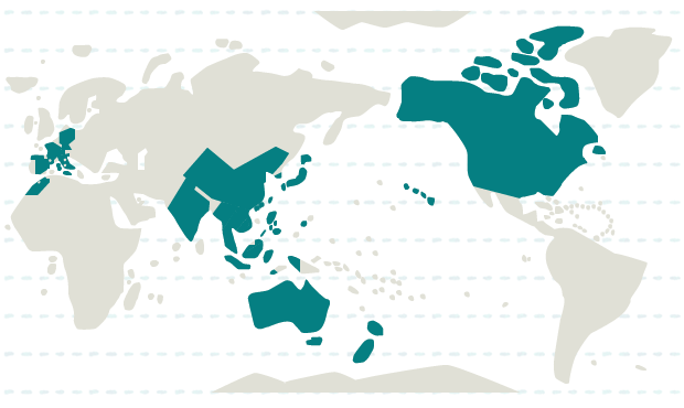 インド、インドネシア、韓国、カンボジア、シンガポール、タイ、台湾、中国、フィリピン、ベトナム、香港、マカオ、マレーシア、ミャンマー、ラオス、日本