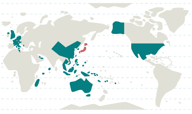 オーストラリア、グアム、クック諸島、ソロモン諸島、ニューカレドニア、パプアニューギニア、パラオ、フィジー