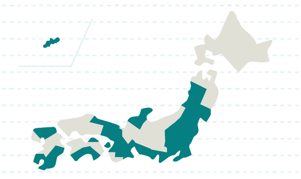 宮城、秋田、山形、福島、茨城、栃木、群馬、埼玉、千葉、東京、神奈川、石川、静岡、愛知、三重、京都、大阪、兵庫、奈良、鳥取、香川、高知、福岡、佐賀、宮崎、鹿児島、沖縄