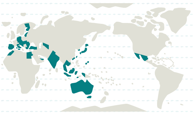 イタリア、エストニア、オーストリア、ギリシャ、クロアチア、スペイン、スロベニア、チェコ、ドイツ、トルコ、バチカン、ハンガリー、フィンランド、ブルガリア、ボスニア・ヘルツェゴビナ、ラトビア、リトアニア、ルーマニア、スロバキア、ポルトガル、ウズベキスタン