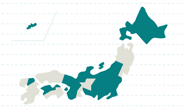 北海道、山形、福島、茨城、栃木、群馬、埼玉、千葉、東京、神奈川、新潟、富山、石川、福井、山梨、長野、静岡、愛知、滋賀、京都、大阪、兵庫、奈良、和歌山、香川、愛媛、福岡、沖縄