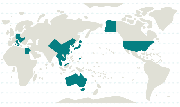 日本、韓国、カンボジア、タイ、台湾、中国、ベトナム、香港、マレーシア、ミャンマー
