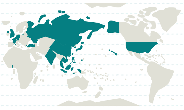 インド、インドネシア、韓国、シンガポール、タイ、台湾、中国、フィリピン、ブルネイ、ベトナム、香港、マカオ、マレーシア、日本、カンボジア、モンゴル