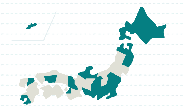 北海道、青森、岩手、福島、茨城、栃木、埼玉、千葉、東京、神奈川、富山、石川、山梨、長野、静岡、愛知、京都、大阪、広島、福岡、鹿児島、沖縄