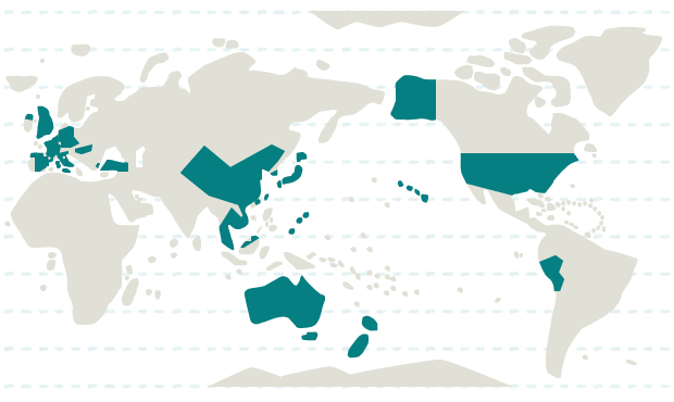 オーストラリア、北マリアナ諸島(サイパン)、グアム、ニュージーランド、パラオ