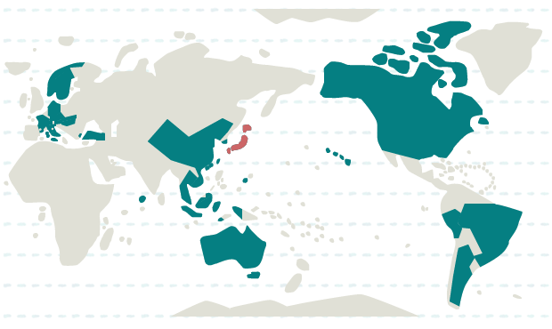 インドネシア、韓国、カンボジア、台湾、香港、マカオ、モルディブ、日本、ベトナム、シンガポール、タイ、マレーシア、中国