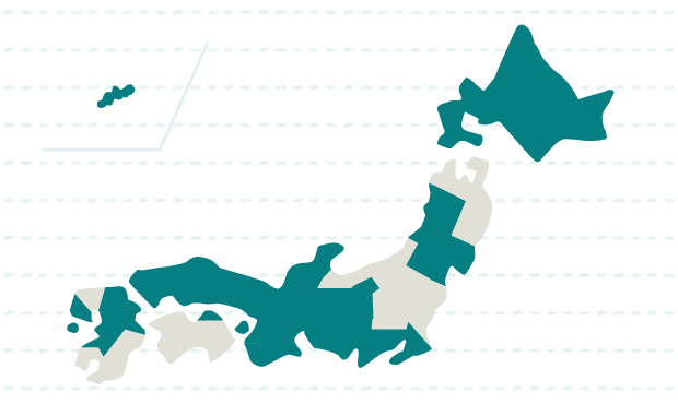 北海道、宮城、秋田、山形、千葉、東京、神奈川、石川、福井、山梨、長野、岐阜、静岡、愛知、三重、滋賀、京都、大阪、兵庫、奈良、和歌山、鳥取、島根、岡山、広島、山口、香川、福岡、長崎、熊本、大分、沖縄