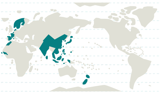 インド、インドネシア、韓国、台湾、中国、ベトナム、香港、日本、タイ、カンボジア、ラオス、フィリピン、シンガポール、スリランカ、ネパール、マカオ、マレーシア