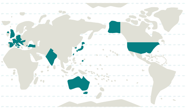 イギリス、イタリア、オーストリア、スイス、スペイン、チェコ、ドイツ、バチカン、ハンガリー、フランス、リヒテンシュタイン、クロアチア、スロベニア、ボスニア・ヘルツェゴビナ、モンテネグロ、トルコ
