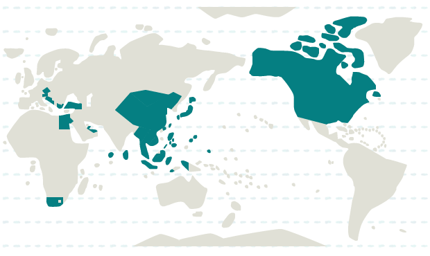 カンボジア、インドネシア、シンガポール、スリランカ、タイ、台湾、中国、フィリピン、ベトナム、香港、マレーシア、ミャンマー、モルディブ、モンゴル、ラオス、日本