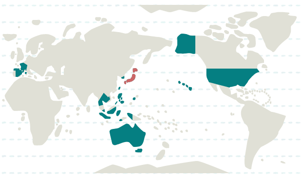カンボジア、シンガポール、タイ、台湾、フィリピン、日本、韓国、インドネシア