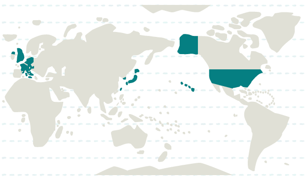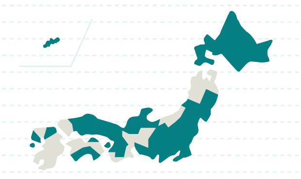 北海道、岩手、宮城、山形、福島、茨城、栃木、群馬、埼玉、千葉、東京、神奈川、富山、石川、福井、山梨、長野、静岡、愛知、京都、大阪、兵庫、奈良、鳥取、島根、岡山、広島、香川、高知、福岡、長崎、沖縄