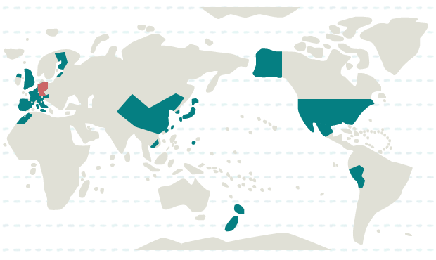 イタリア、オーストリア、オランダ、スイス、スペイン、ドイツ、バチカン、フィンランド、フランス、ベルギー、エストニア、ラトビア、イギリス、ポルトガル
