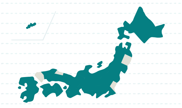 北海道、青森、宮城、秋田、山形、福島、栃木、群馬、埼玉、千葉、東京、神奈川、新潟、富山、石川、福井、山梨、長野、岐阜、静岡、愛知、三重、滋賀、京都、大阪、兵庫、奈良、和歌山、島根、岡山、広島、徳島、香川、愛媛、高知、福岡、佐賀、長崎、熊本、大分、宮崎、鹿児島、沖縄