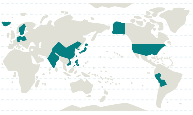 インド、韓国、カンボジア、台湾、中国、フィリピン、ベトナム、日本